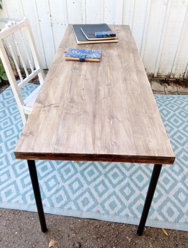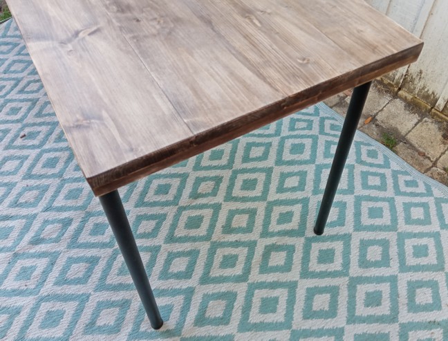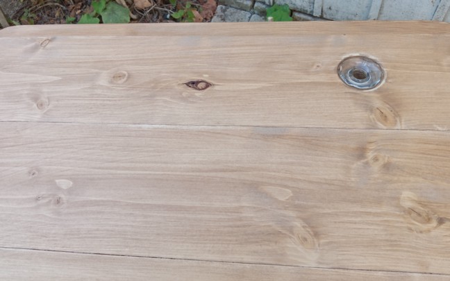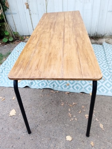 Le plateau ancien étant en aggloméré, un plateau neuf a été refait en lattes de pin. Il a été teinté et huilé afin de le protéger.