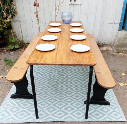 Les bancs photographiés avec la table sont vendus à part et toutes les informations à leur sujet sont dans une autre fiche.