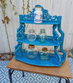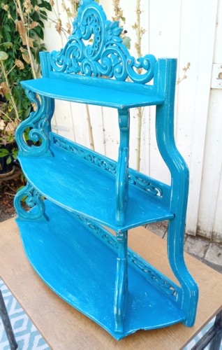 | | Etagère très festonnée en bois, patine usée bleu paon.