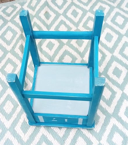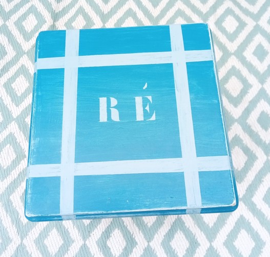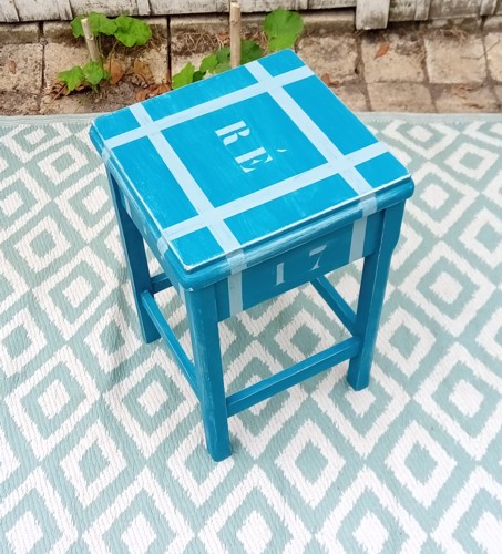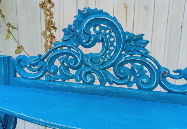 Patine bleu paon usée, inscriptions et rayures en bleu printemps sacré.