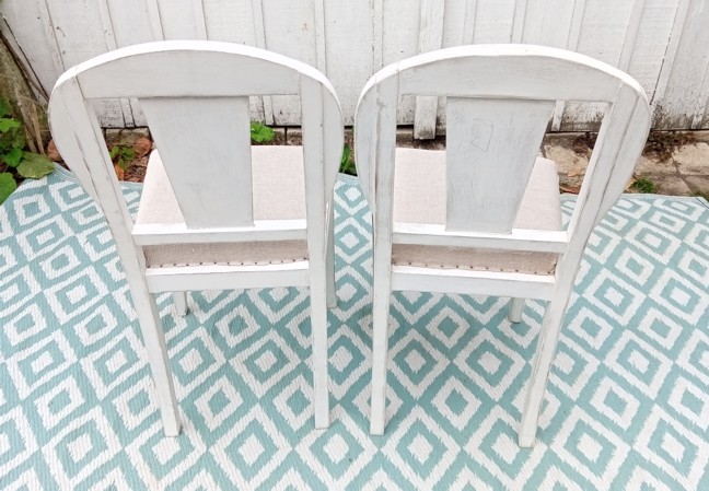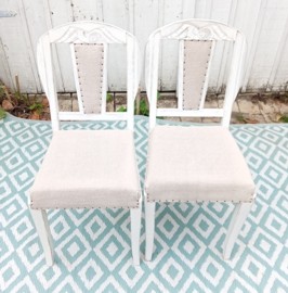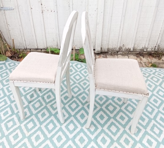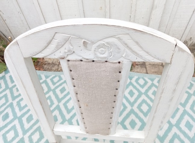 Elles ont été poncées, taitées contre les insectes ( présence de trous) puis patinées en lin blanchi faisant ressortir le motif sur le dossier.