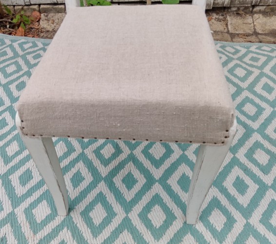 L'assise a été refaite en mousse ferme et tapissée de gros lin brut retenu par des semences de tapissier.