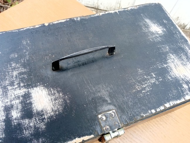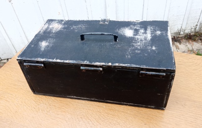 Fermeture métallique, mais l'anneau sur le devant de la boite n'est plus utilisable pour y mettre un verrou, il permet juste de bloquer l'autre partie qui est sur le couvercle pour la transporter.